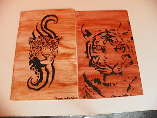 These are two paintings i did back in the summer, they are in my room but you cant see them and this picture dose not do the justice. The leopard is actually a copper/gold color not orange and the tiger is a copper/orange color not a red orange.